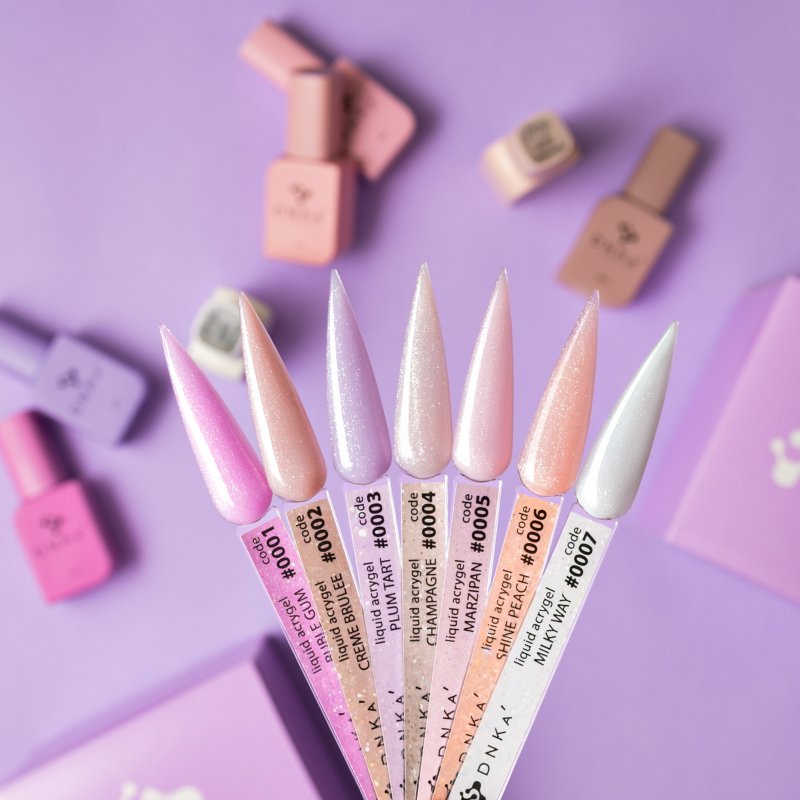 DNKa' Liquid Acrygel – это коллекция жидких гелей, предназначенных для укрепления ногтевой пластины. Благодаря низкому уровню кислотности, жидкий акригель абсолютно безопасен для ногтей. Подходит для тонких и чувствительных ногтей и имеет среднюю консистенцию. Он отлично выравнивает и укрепляет как короткие, так и длинные ногти. Гель не деформируется во время носки и сохраняет идеальный блеск до коррекции.