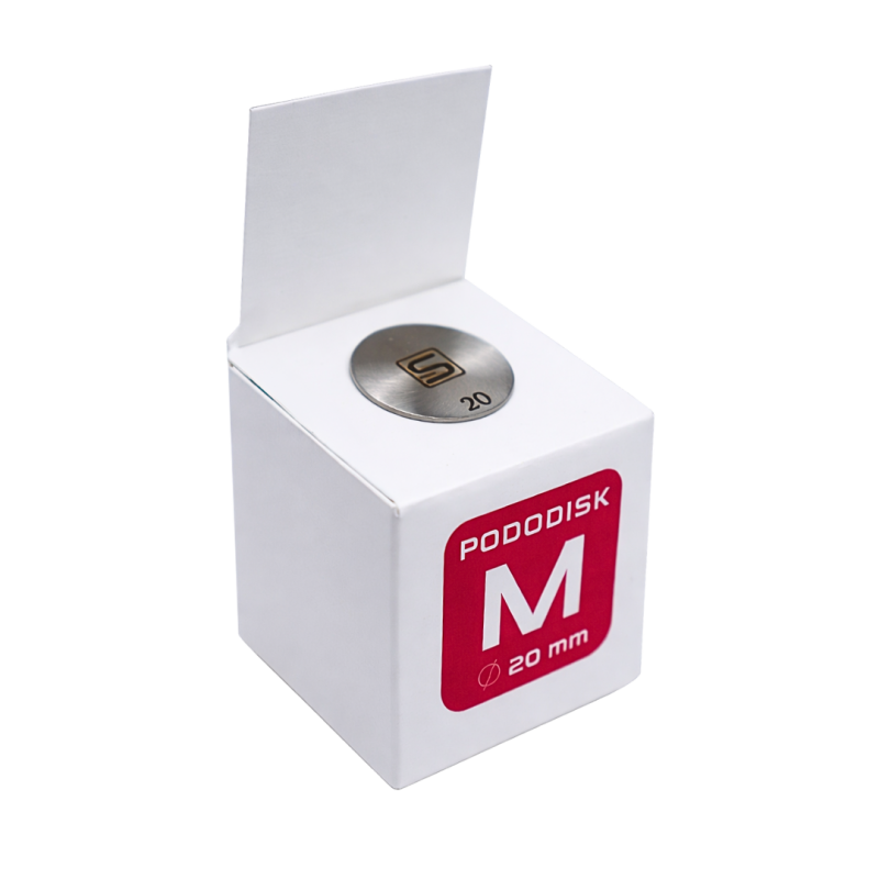 Педикюрний диск ProSteril є насадкою для фрезера з нержавіючої сталі, на яку кріпляться одноразові змінні файли. Педикюрний диск розміру М (діаметр 20 мм) дозволяє якісно обробляти огрубілу шкіру стопи у важкодоступних місцях, а також видаляти шкіру, що орогіла, на пальцях ніг.