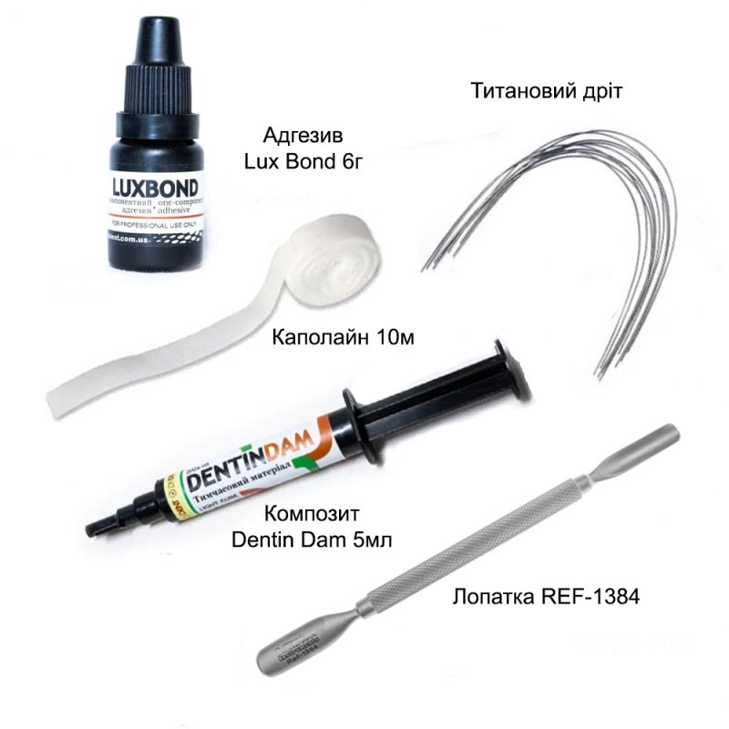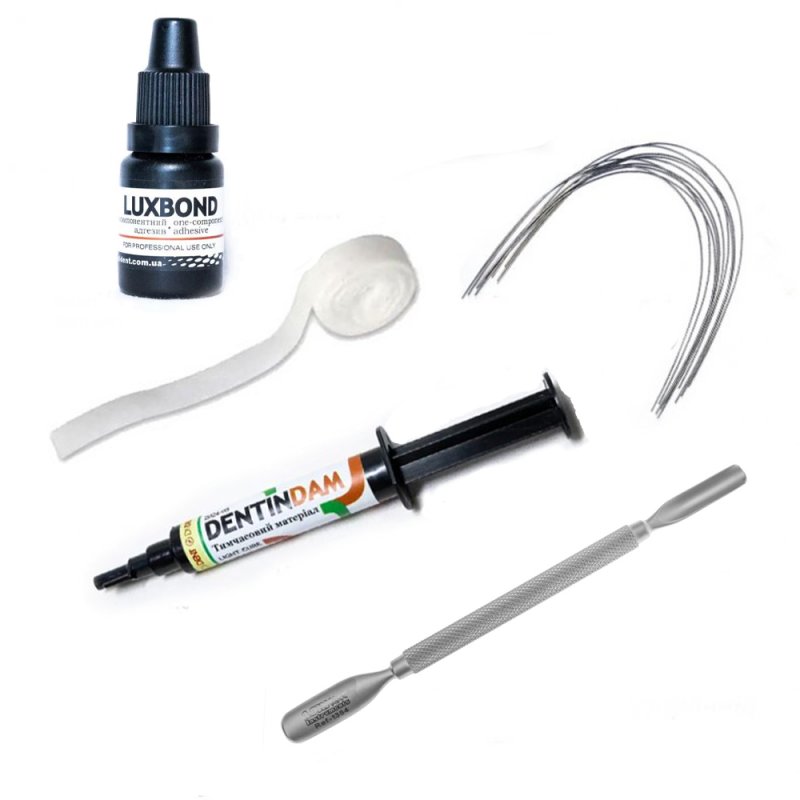 - Можна наносити композит LuxBond порційно, фіксуючи світлом по 10 -15 секунд. У такій схемі потрібно остаточна фіксація 40сек. Порція адгезиву не повинна просвічувати дріт.